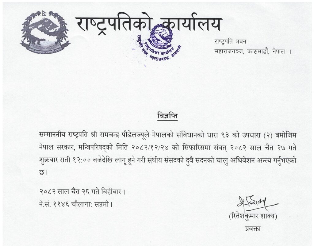 गृहपृष्ठ ∕ Breaking ∕ Federal Parliament Session to end Friday midnight Breaking Federal Parliament Session to end Friday midnight KathmanduPati April 09, 2026 KATHMANDU -The Federal Parliament Session is to be prorogued from Friday midnight. President Ramchandra Paudel made the announcement to end the current session of the Federal Parliament at the recommendation of the Council of Ministers on April 7 in accordance with Article 93 (2) of the Constitution of Nepal, according to the Office of the President. The meeting of both houses had begun from April 2. Write your comments RELATED NEWS PM Shah asks NA officers to serve nation being disciplined,… Swiss Ambassador pays courtesy call on Speaker Aryal Ambassadors pay joint courtesy call on PM Shah Nepali Army always committed to upholding national unity: CoAS Sigdel Deputy Speaker’s election to take place on Friday Minister Pokharel pledges government support for Phapla cricket stadium Top Headlines Before the Ballots: How Oli Lost the Political Narrative1 Nepali Congress provides financial assistance for Samba’s treatment2 NC President Thapa expresses sorrow over Dhading bus accident3 PM Karki addresses 61st Session of Human Rights Council: Reaffirms Nepal’s unflinching commitment to advancing human rights4 Govt declares three-day public holiday of election5 Jagdamba Group Chairman Shankar Agrawal Arrested6 We will return the savings of cooperative victims within 100 days : Rabi Lamichhane7 Two Offices Under Ministry of Communication to Be Abolished8 TRENDING Once on the Margins, Women Diplomats Are Now Making Their Mark in Nepal’s Foreign Service Sector Pathao, Tootle resume ride sharing services after authorities relax lockdown A phone call that paved the way for RAW Chief’s visit to Nepal UPAYA CITY CARGO LAUNCHES Version 3.0 Impact of Social Media on Nepalese Society Public Relations for a Soldier Why Are Boys Unexpressive? Police make a woman public in connection to Gongabu murder case